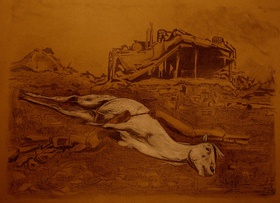 Genau das ist die Faszination, die von Peggy Steikes Bildern ausgeht. Und das ist ihr Grund, diese Bilder zu zeichnen. Wir haben alle schon KZ-Häftlinge auf den alten, unscharfen schwarz-weiß Fotos gesehen - gezeichnet geht eine Gewalt von Ihnen aus, die sprachlos macht. All diese Medienbilder, sei es das auf Wikileaks veröffentlichte Video in dem US Hubschrauberpiloten Zivilisten erschießen, die einem anderen helfen wollten, sei es das pakistanische Kind in Schuluniform, welches im Februar 2010 einen Selbstmordanschlag verübte oder auch das skurrile 22-sekündige Video von Gaddafis regenbeschirmtem Interview – Peggy Steike hat sie alle aufgegriffen und auf Leinwand gebannt.